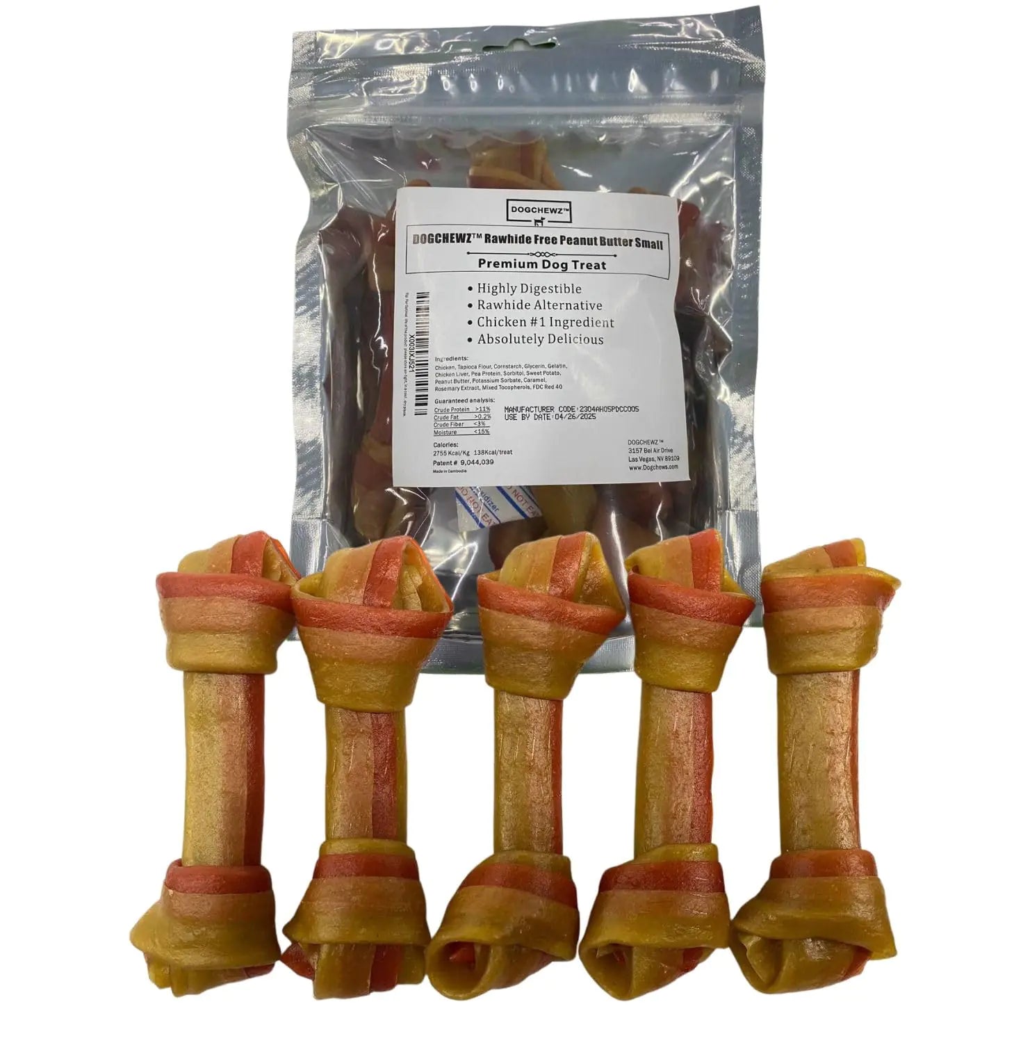 Give your small dog the ultimate chewing pleasure with Rawhide Free Knotted Bone Peanut Butter Small Dog Chew Treats. This 5-count bag of 5-inch treats offers a delightful blend of peanut butter and chicken flavor enticing your furry friend with each savory bite.Peanut Butter Flavor with a Chicken Twist:These knotted bone treats are infused with mouthwatering peanut butter flavor complemented by a hint of chicken taste creating a delectable combination that will leave your dogs tail wagging for more.Rawhide-Free and Gluten-Free Formula:At DOGCHEWZ we prioritize your pets safety and well-being. These knotted bones are free from rawhide ensuring a choking hazard-free chewing experience. Moreover they are gluten-free making them a suitable choice for dogs with dietary sensitivities.Long-Lasting and Enticing:Crafted to withstand vigorous chewing these treats offer long-lasting entertainment for your small dog keeping them happily occupied and away from destructive behaviors.Ideal for Training and Rewards:These knotted bone treats are more than just delicious snacks. Use them during training sessions or as rewards for positive behavior reinforcing good habits and strengthening your bond with your furry companion.Premium-Quality Ingredients:We care about your pets health which is why these knotted bone treats are made with high-quality ingredients. Free from harmful additives they offer a safe and wholesome option for your furry family member.The Dogchew design is so unique that it was a United States Utility Patent #9044039Elevate your dogs treat time with Rawhide Free Knotted Bone Peanut Butter Small Dog Chew Treats. Offer them a safe savory and entertaining experience that will keep their tail wagging and their heart content. Add this 5-count bag to your cart now and make your furry friends day more delightful!